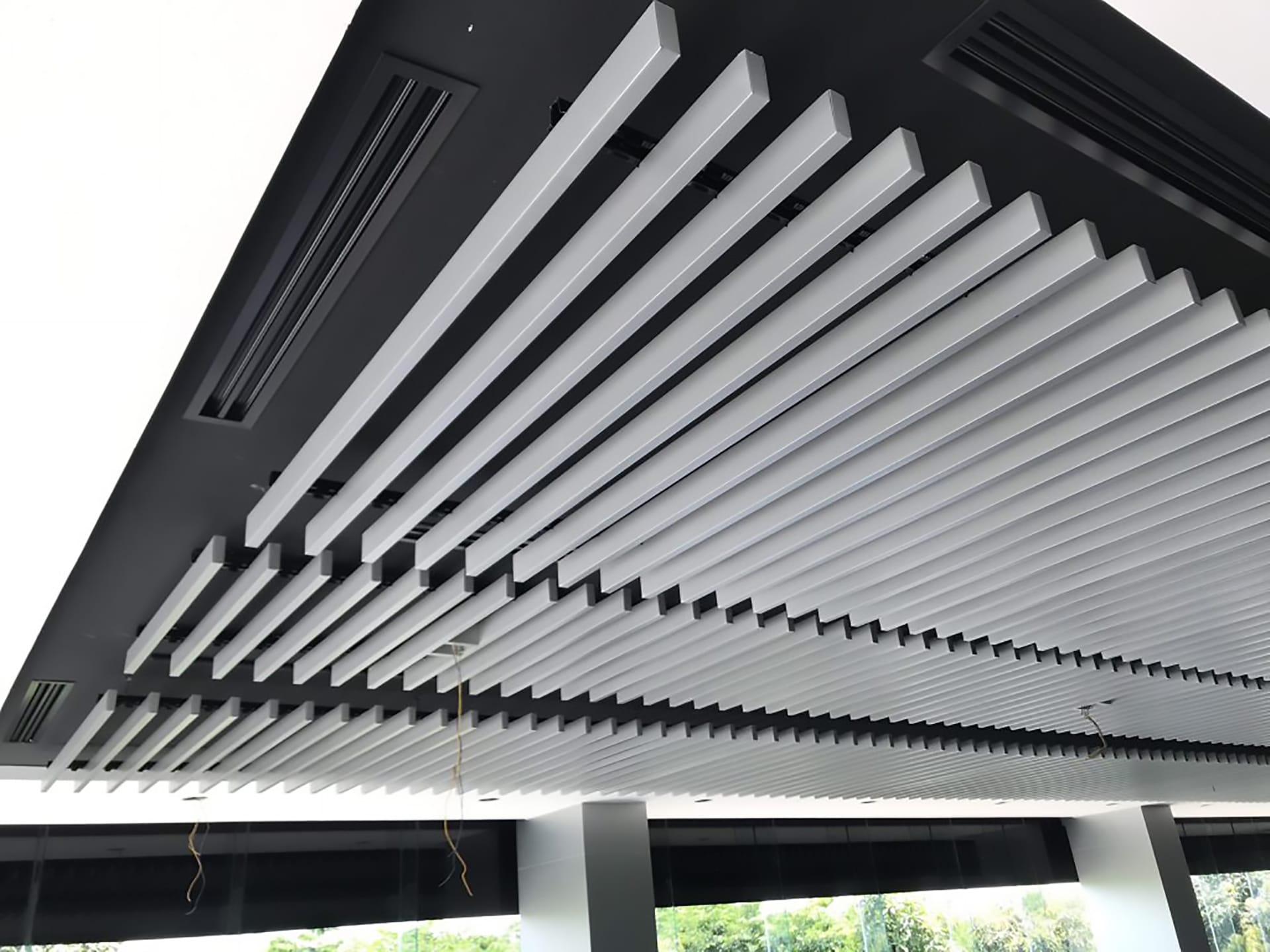 Trần nhôm Valu Baffle: Kiểu trần dạng thanh dài song song, tạo không gian thoáng đãng, thích hợp cho trung tâm thương mại, nhà hàng, sân bay.