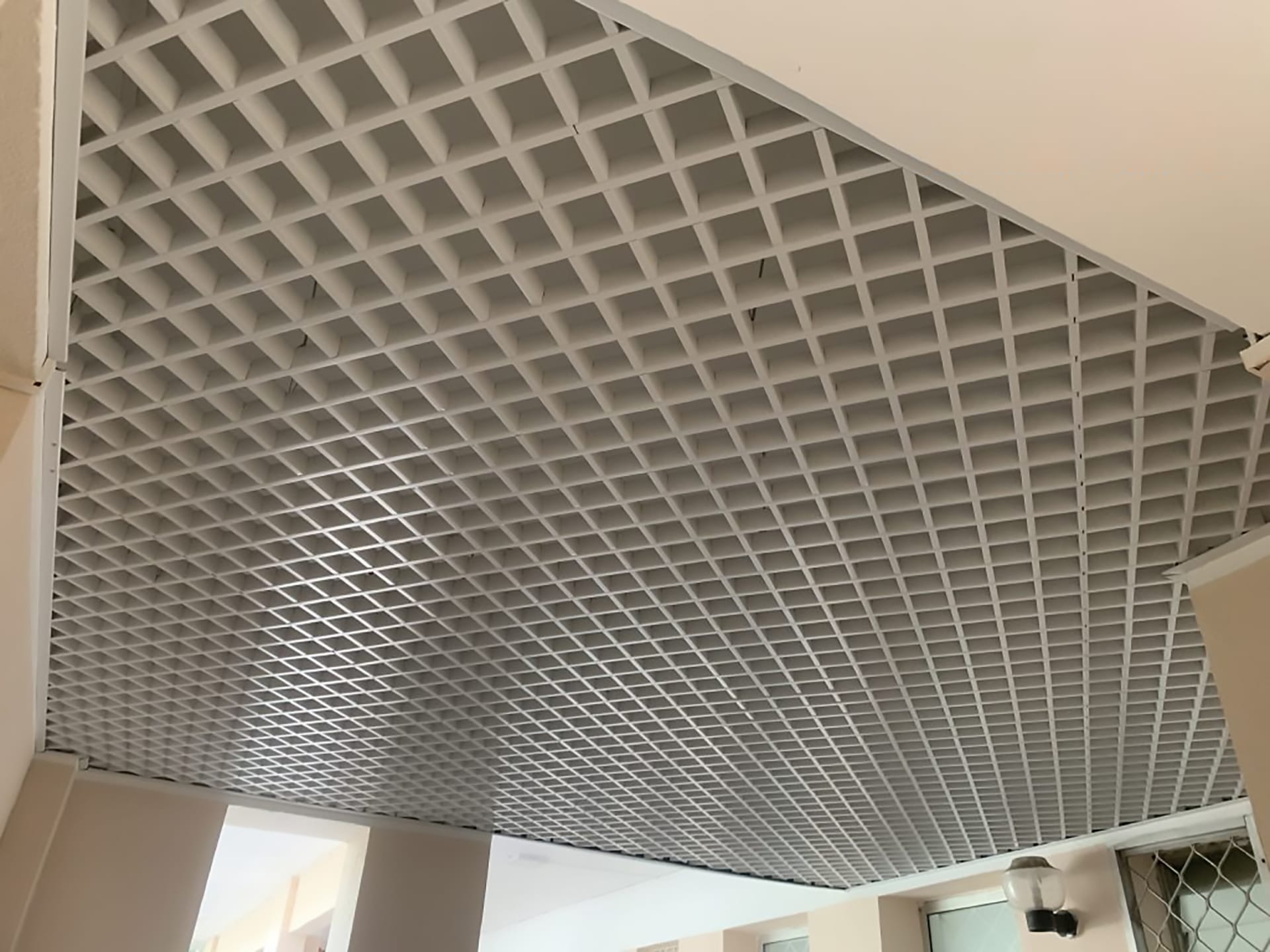 Trần nhôm Valu Caro: Thiết kế dạng lưới giúp thông gió tốt, thường sử dụng trong siêu thị, bệnh viện, nhà ga.